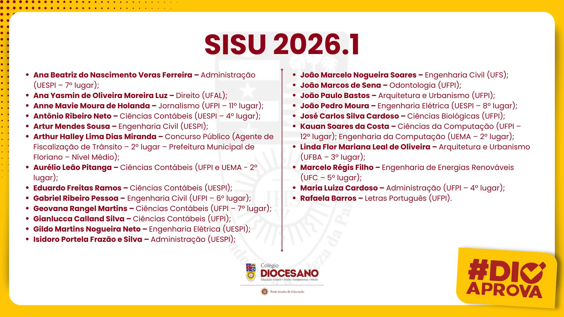 Entre os estudantes, a vivência dessa formação ganhou um significado ainda mais concreto na trajetória de João Marcos de Sena, bolsista do Colégio Diocesano, aprovado em Odontologia pela UFPI no SISU 2026.1, com 960 na Redação. Ele relata que o início do terceiro ano foi marcado por ansiedade e inseguranças, mas que encontrou na bolsa de estudos e nos programas pedagógicos da escola o suporte necessário para evoluir academicamente e emocionalmente.