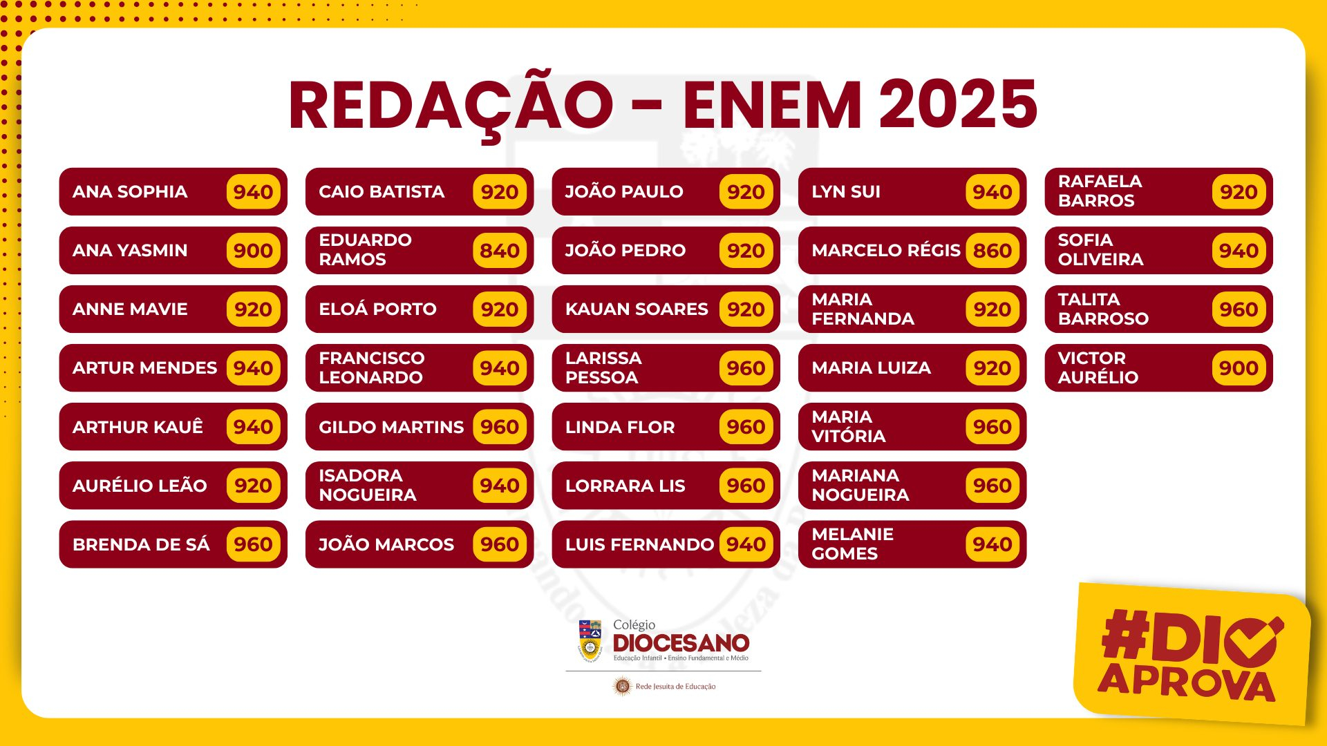 “A proposta pedagógica do Colégio Diocesano, fundamentada na Pedagogia Inaciana, enxerga o estudante não apenas como um candidato a uma vaga na universidade, mas como uma pessoa em formação integral indo em busca da realização de seu projeto de vida. O desempenho no ENEM é um tripé formado por conhecimento, estratégia e controle emocional. Esse olhar humano de nossa preparação aos vestibulares retira o peso da ‘obrigação’ e coloca o ENEM como um rito de passagem natural e consciente”, adiciona.